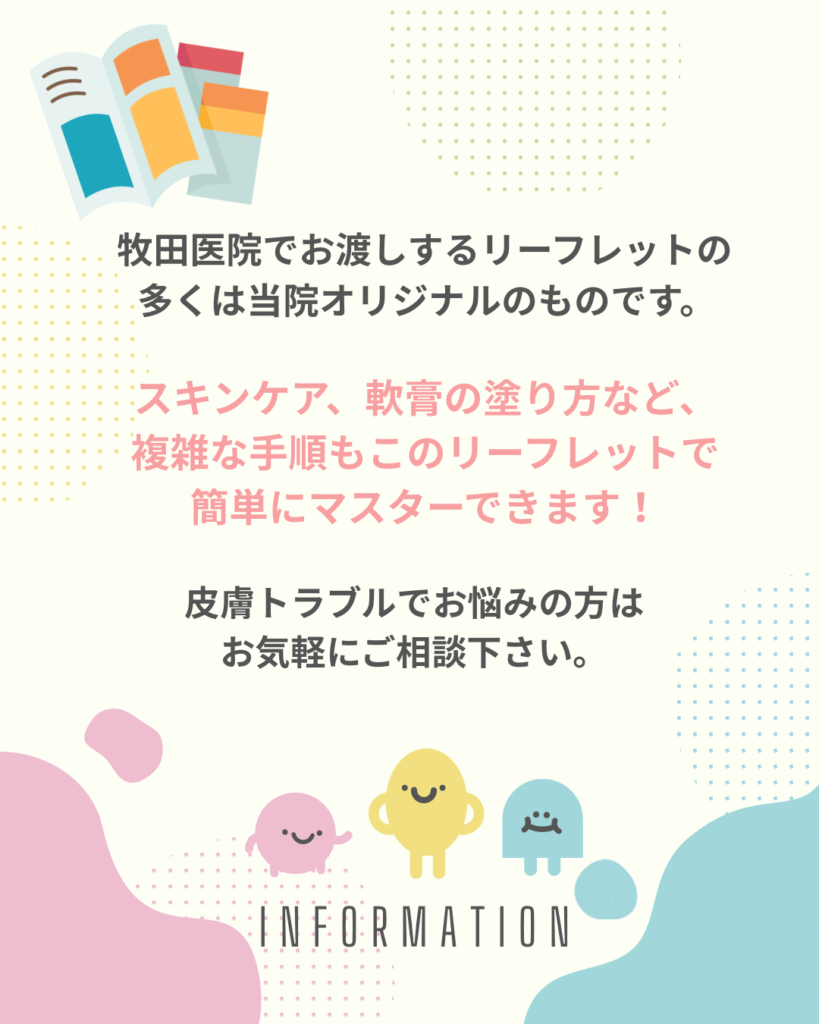 牧田医院2F皮膚科には皮膚トラブルをかかえた患者さんが多く受診されます。主な治療はスキンケア、軟膏塗布になりますが、軟膏の種類・塗り方など複雑なケースが多いです。そこで当院ではオリジナルのリーフレットを作成し、それをもとに患者さんにご指導しています。ナースの力作がお役に立てましたらうれしいです😊