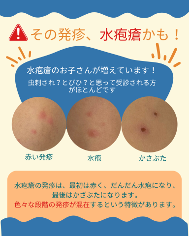 最近水ぼうそうの患者さんが増えてきています😳ワクチンを済ませたお子さんが多いため、熱がなかったり、発疹が数個のケースも多いです。そのため、最初は「虫刺され」や「とびひ」かもと受診される方もいらっしゃいます。最初の発疹が虫刺され🦟と似ているた...